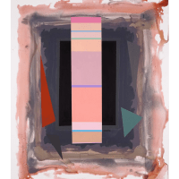 Contributed by Jonathan Stevenson / At Nancy Hoffman Gallery, Peter Plagens’ bracing new abstract paintings don’t so much as invite you in as dare you not to enter. Each canvas consists of three basic components: a painted frame of washy gray or brown; a pristinely rendered hard-edge shape, assertively opaque, centrally positioned, vertically symmetrical, and horizontally striated; and scattered, seemingly directional slashes. The second feature propels the paintings, but the other two steer them. The distinctly dilute vagueness of the frames might impart risk, the pesky shards impulse, and the vivid, intuitively color-coded ramps expansive fate – humble versions of Jacob’s Ladder, vouchsafing a future that need not be feared, at least distantly echoing one of Dave Hickey’s blithely peremptory and eminently arguable mantras: “Beauty is and always will be blue skies and open highway.”