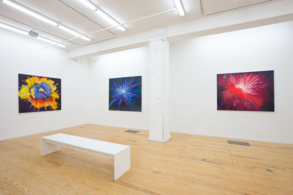 Joy Garnett’s forceful new paintings capture the evanescent bursts of violence recorded by photojournalists (like fictional Sarah) around the world while also acknowledging the comfort of distance that softens the apprehension of a far-off war by an artist in her studio — and which Sarah disdains. Seeking to transform her secondary experience of the depicted events into something more authentic, Garnett culls photographs of military explosions from online sources, reconstituting the harrowing, split-second images using traditional oil paint and canvas. Painting fast and loose, she renounces exactitude to embrace clunky, restless brushwork that fuses painterly glee with exasperated rage, setting the explosions adrift from both their geographical and their political contexts.
