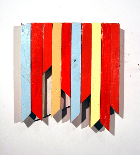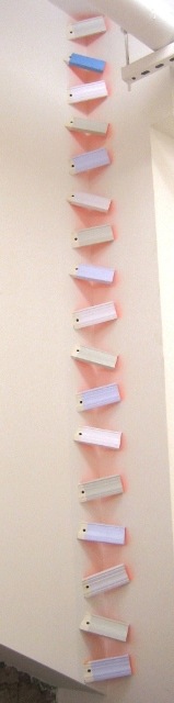 Cordy Ryman, “Waiting for Christopher,” 2010, acrylic & enamel on wood, screws – 23 pieces, dimensions variable: 87 x 6 1/4 x 2 3/4″ as installed w/ 17 pieces