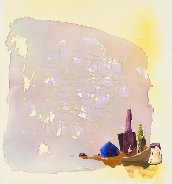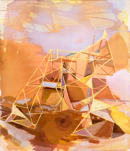In earlier work, Gualdoni investigated failed utopias of Modern architecture, portraying decayed, imploded buildings crumbling into pools of paint. In �Shadows Slipping,” she loosens control, and, like color field painters before her, begins each painting with a thin veil of poured paint that determines the direction the canvas will take. �The shift in the work,” Gualdoni writes, “compared to previous bodies, is in favor of improvisation, and against a photographic basis, in favor of degrees of presence.” There’s a poignant sense of unknowing in Gualdoni’s impressive new work. Whereas in previous paintings she featured lavishly-painted structural elements of defunct worlds, in her new work Gualdoni sheds the nostalgic architectural references and authoritative facture to find meaning in the process itself. Gualdoni is decisively moving forward by imagining how we might build something unfamiliar from our inherited wreckage.