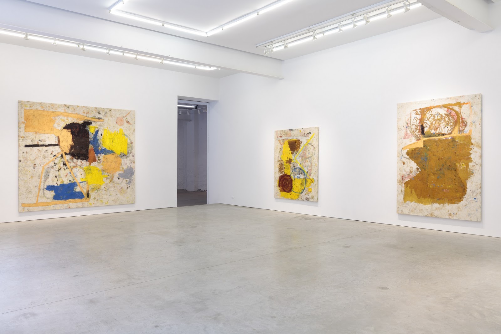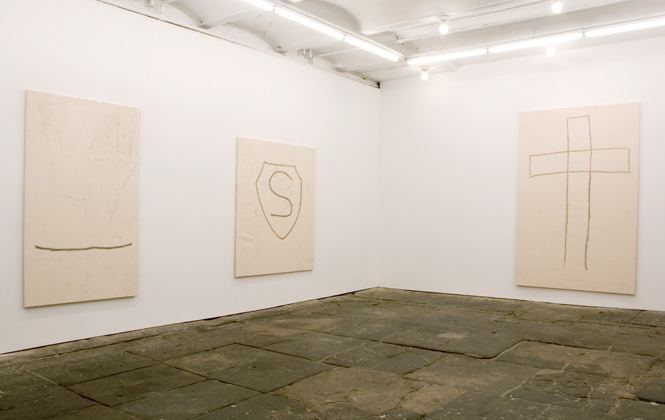 Bradley has returned to painting after his coy outings with grease pencil on canvas at Canada and painted frames at Mitchell-Innes & Nash. Perhaps he has sheepishly begun to find meaning in the painting process. Just as likely, however, he saw MoMA’s Abstract Expressionism show and is riffing on the earnest way they slung paint back in the day. In the New York Observer, Will Heinrich argues that Bradley’s more painterly images still don’t mean anything. “A line of framed pencil, ink and crayon drawings are hit or miss: a simple round face with back-and-forth hair and a triangle nose, or a stick-legged figure on the back of a ripped orange flier, balance childish impulse perfectly with an adult eye. Yet a cartoon hand holding a cross not only doesn’t mean anything but doesn’t even mean anything by not meaning anything.