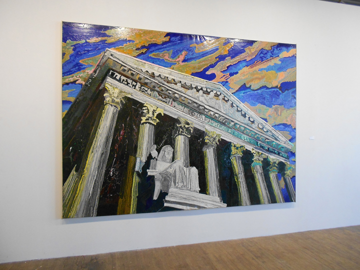 A while back, Two Coats ran a post about Jonathan Waters, the mastermind behind A-Space Gallery and West Cove Studios just outside New Haven. This Saturday, “Scale Factor,” a group exhibition that explores ideas about size, opens the new season at A-Space. I contributed “Bigger Than Pat Steir,” a new piece that references Steir’s recent show at Cheim and Read. Made of unstretched linen stapled to the wall and a 30″ x 40″ stretched and painted canvas, the piece, at 18,000 square inches, is slightly bigger than one of Steir’s massive new paintings. I also have two small 2011 studies on wood panel (see image at top) in the show. I used to do interim studies like this on the computer, but recently I’ve started doing them by hand. Cat Balco, Ethan Boisvert, Emilia Dubicki, Cham Hendon, Chris Joy, Larry Morelli, Jerry Saladyga, Jean Scott, Brian Gil Wendler and Jonathan Waters all contribute heroic works that range from public grandeur to confessional intimacy.
