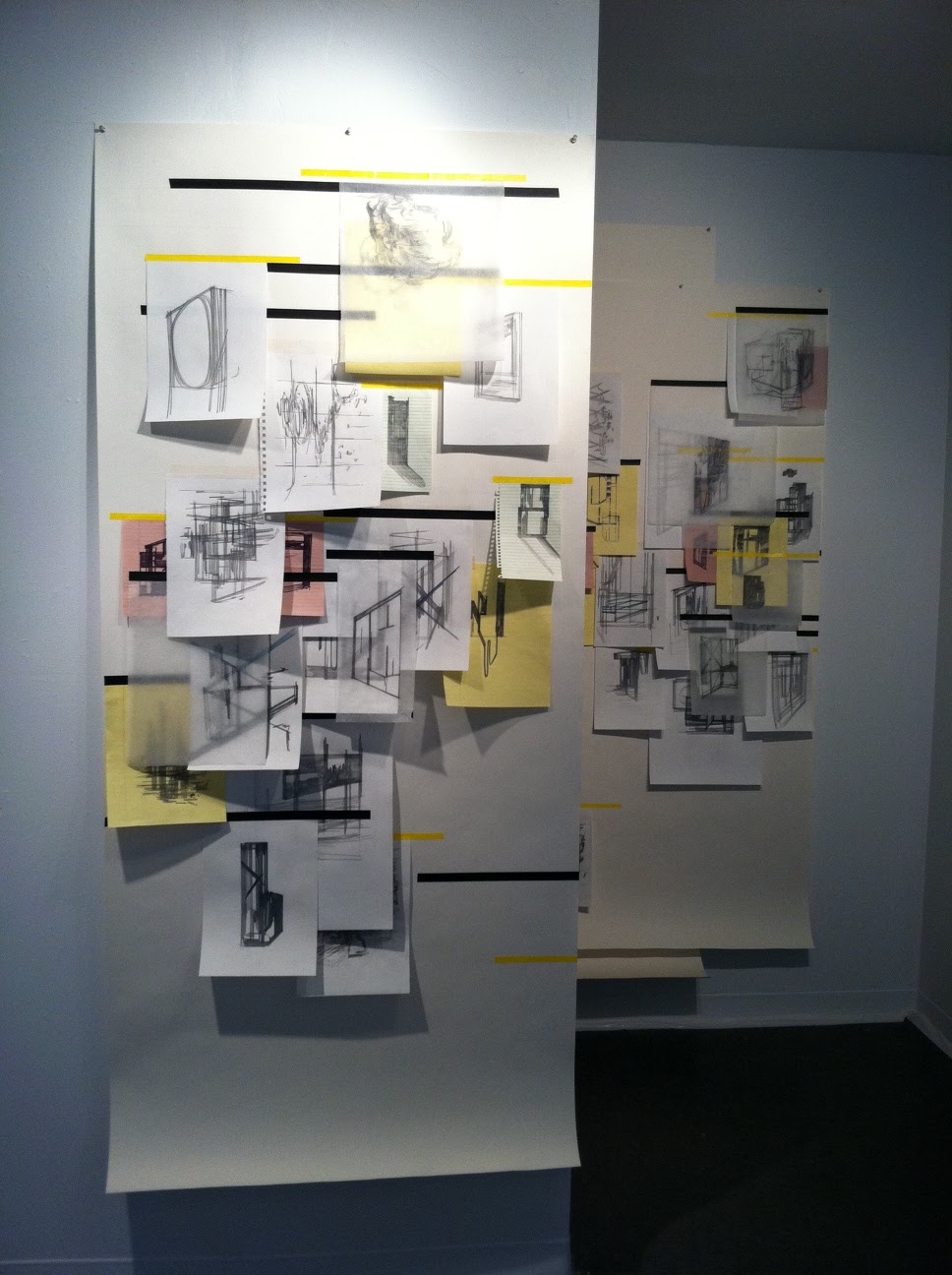 On Sunday, Nashville-based blogging painter Mary Addison Hackett and I took a trip to the Lower East Side to visit the New Museum, check out the Festival of Ideas for The New City, and stop by some galleries. For the festival, Frosch & Portmann gallery invited Swiss artist Raffaella Chiara to spend a month doing an ad hoc studio residency in an apartment on the LES, and Chiara drew her way around the city. The result is a series of small pencil drawings whose abstract, architecturally-inflected images coalesce from straight, decisively drawn lines. Installed with electrical tape in overlapping layers, the series captures the intensity Chiara discovered in New York and evokes the ADD that New York brings out in visitors. Remember Broadway Boogie Woogie?