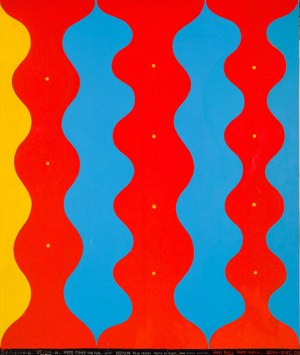 “Although abstract, Martin’s paintings are a direct response to the physical world around him. Many of his works integrate objects from his immediate environment into their surfaces, including kitchen utensils, records, photographs, and Persian carpets. The works are as much about daily life — music, travel, and language — as they are about mythology, storytelling, the endurance of symbols, and the role of painting in art history.