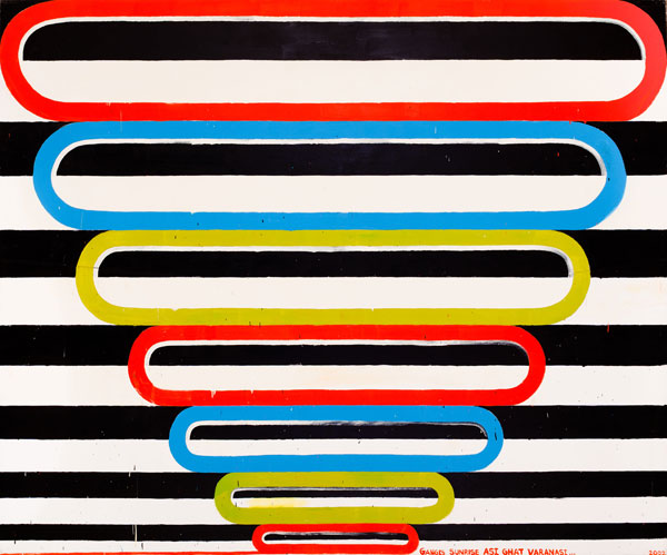 When I first started writing for The Rail, in an article about the Tomma Abts show at the New Museum, I took a quote from a Chris Martin interview out of context, suggesting that he preferred working in a small scale. “I actually LOVE working on a huge scale and have done so for years,” he wrote to me. “What I had a hard time with was ‘medium’ size paintings – 4′ – 6′ – so I actually felt compelled to paint smaller.” His show at the Corcoran, which opens on June 18th, will prove beyond any doubt Martin’s love of LARGE. The exhibition is divided in three parts: one section brings together large-scale works from the past nine years; another is a wall of small paintings hung salon-style in the Rotunda, and the third features a site-specific installation of paintings in the museum’s central atrium in which three paintings, each 26 feet high, will be suspended from the second floor of the museum to the ground, creating monumental walls of color and pattern.