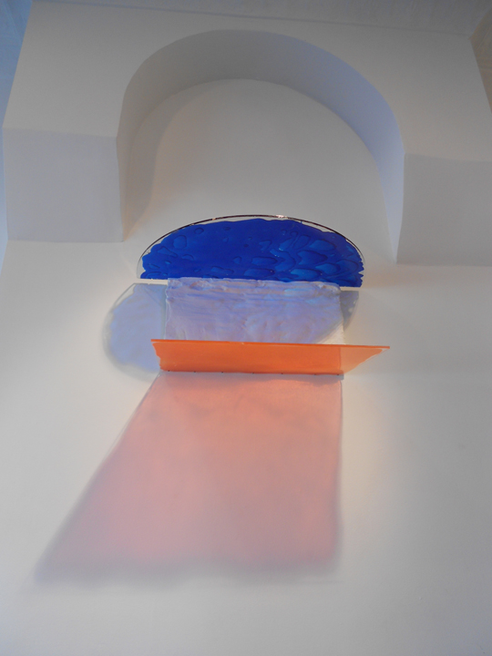 Using polymers, dyes, wood, and plexiglass, Christian Sampson explores how color, light, and shadow, while shifting between two and three dimensions, create form. I saw two of Sampson’s ingenious but humble pieces last week in “itinerant ones,” an exhibition at STOREFRONT that was curated by painter Jules de Balincourt. A 2006 Hunter MFA grad, Sampson lives in Brooklyn and thinks about things like 19th century phantasmagorical use of color, the psychology of the shadow, magic lantern slides, Donald Judd’s use of translucency, and Paul Scheerbart’s essays. “I think my form is created by combining the amorphous as a catalyst against the elemental frame,” Sampson said in a 2009 interview with independent curator Jon Lutz. “I’m interested in painting as a hyperbolic gesture, one that interweaves wave-lengths of light color, and structure into a form both frozen and animated…” Sampson’s work riffs on notions that Donald Judd and James Turrell’s work explores, but his intuitive, less rigorous approach seems well-suited to our DIY times.