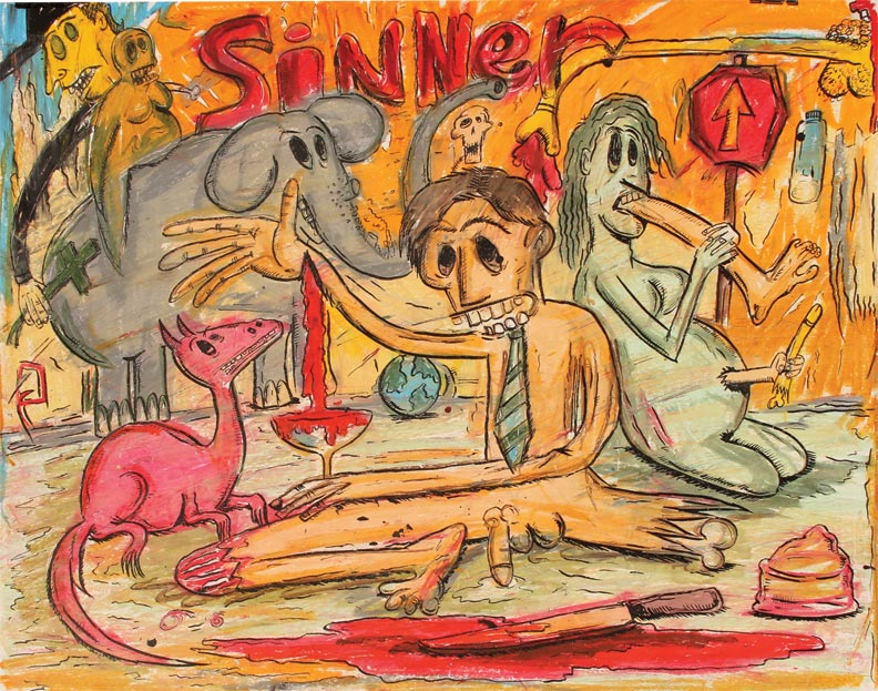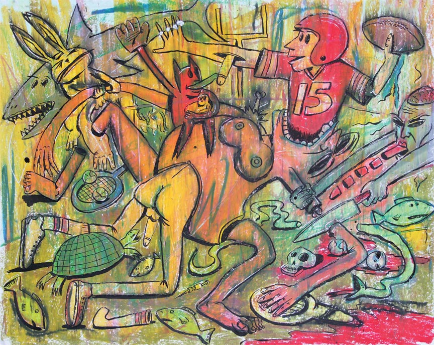 Septien, a darkly comic narrative film, features a self-taught artist who fetishizes sports and Satan. The film premiered in June at the BAMCinemaFest and will be at the IFC this week. I recently received a note from Onur Tukel, who tells me that besides acting in the film, he made all the paintings–which look like a mash-up of Hieronymous Bosch and illustrations from Mad Magazine. Here’s an email exchange we had about the project.