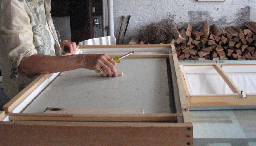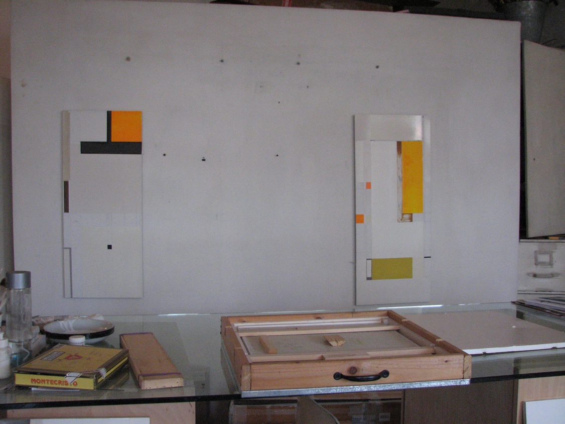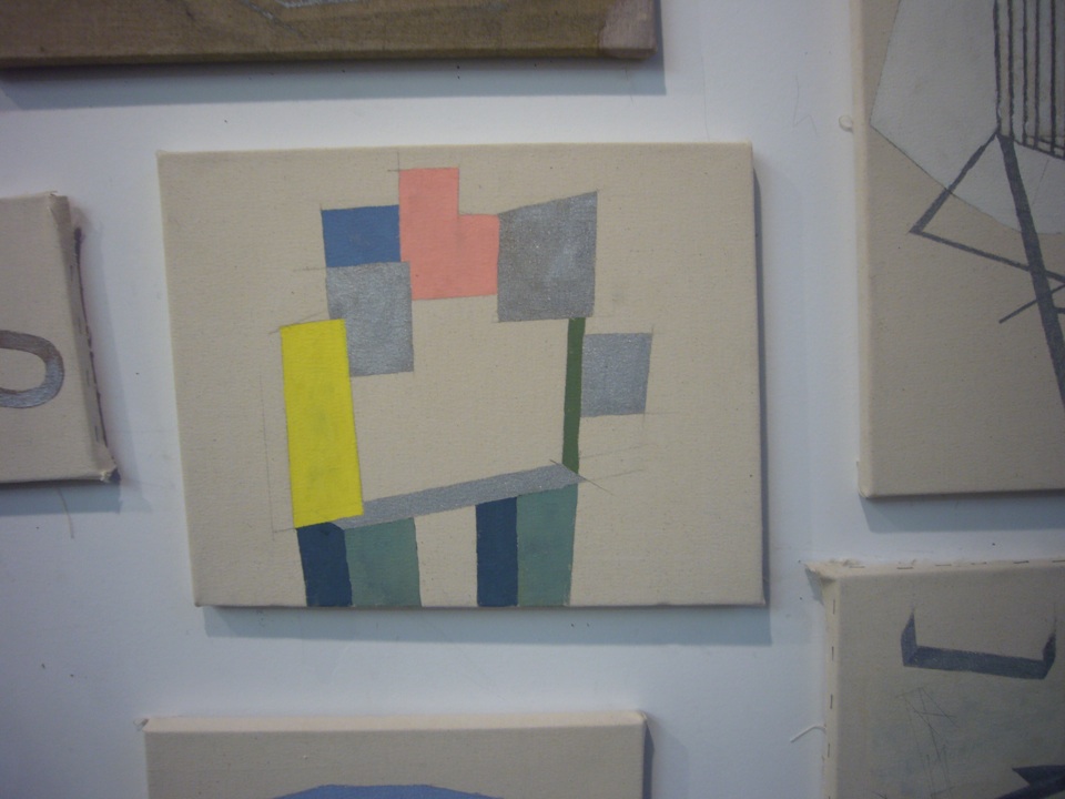 Joan’s painstaking attention to surface and her meticulous treatment of the geometric shapes’ edges were the first things that caught my eye. Unlike my more haphazardly composed, improvisational approach, Joan’s strategy begins with a rigid grid structure and explores the mysterious Fibonaci Sequence that occurs throughout nature and history. (The first two Fibonacci numbers are 0 and 1, and each subsequent number is the sum of the previous two.) She grinds her own pigments and mixes each color with poppy seed oil, which is less likely to yellow with age but is also known for taking a long time to dry. The color relationships are precise and purposeful. Sometimes, Joan told me, it takes years to complete a single piece.