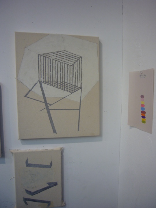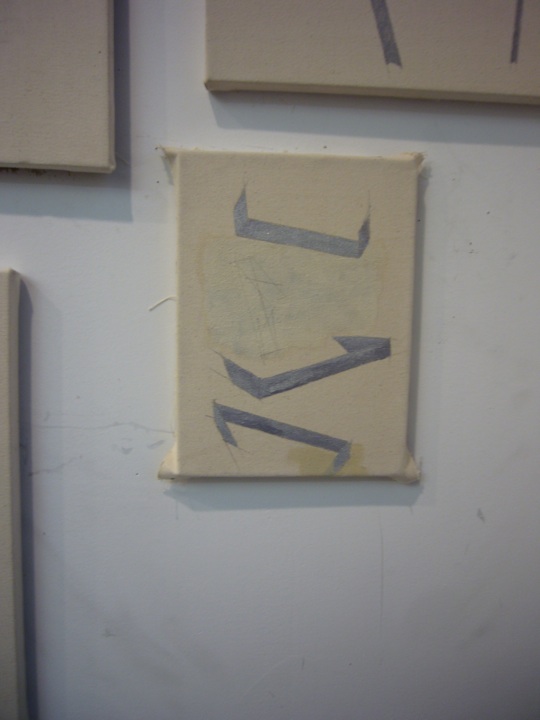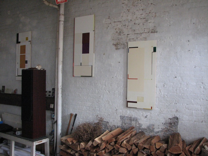 Having just returned from a summer spent wandering around the plains of her native Nebraska and working at the Artfarm Residency in Marquette, Joan began unpacking her paintings from handmade wooden crates and hung them randomly on the nails poking out of the bare walls. Each painting features a combination of line and rectangular shape, all aligned either perpendicularly or parallel to the edges of the honeycomb aluminum panels, which vary in size but are generally about 15 inches wide by 36 inches tall.