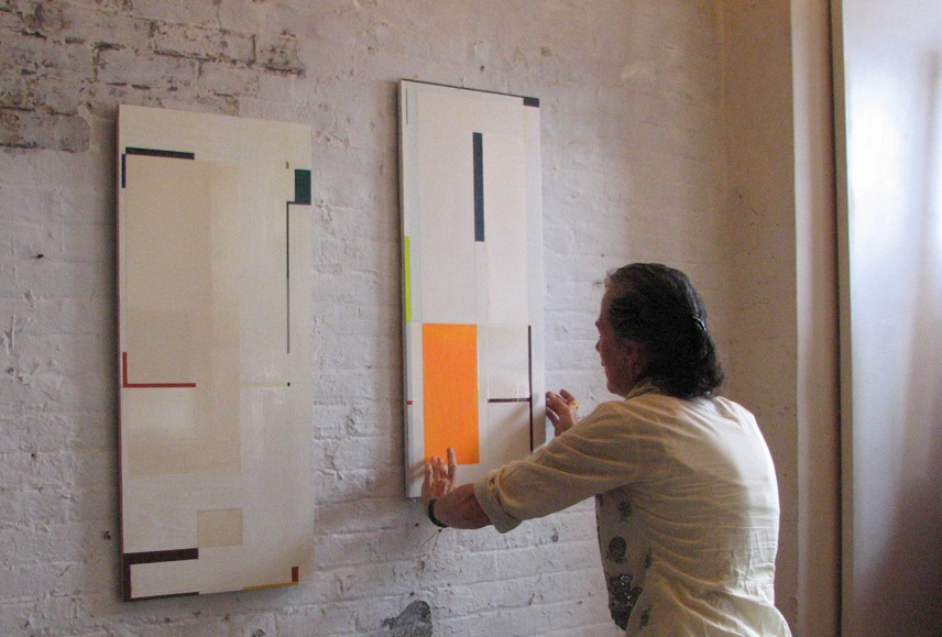 I think there are two kindred views about painting that tightly connect Joan’s work and my own. First, we share the conviction that meaning resides in uncluttered, open space. Second, we both believe that a painting derives significance not merely from the shapes and lines we paint on the surface, but also from the processes we employ in its creation, from the choices we make as to its tangible attributes (size, shape, paint, medium, texture, stretched versus unstretched, etc.), and from the way in which the painting as an object fits into a much wider physical context.