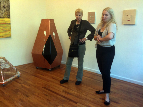 Laurie Fendrich and Tatiana Berg discussing the wheels on the bottoms of Berg’s pieces. The wheels, which convey a humorous pragmatism, also lend the three-dimensional paintings a wry sense of transience.