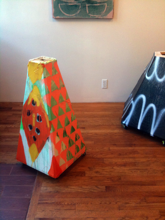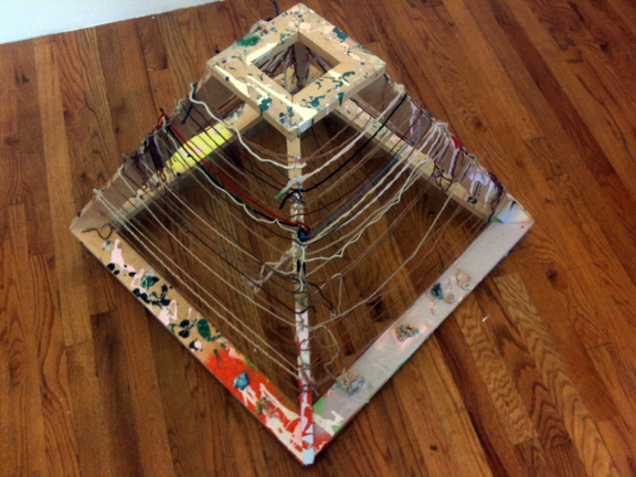 One of Tatiana Berg’s “tent” paintings. Wood frame, staples, yard and string with wheels.