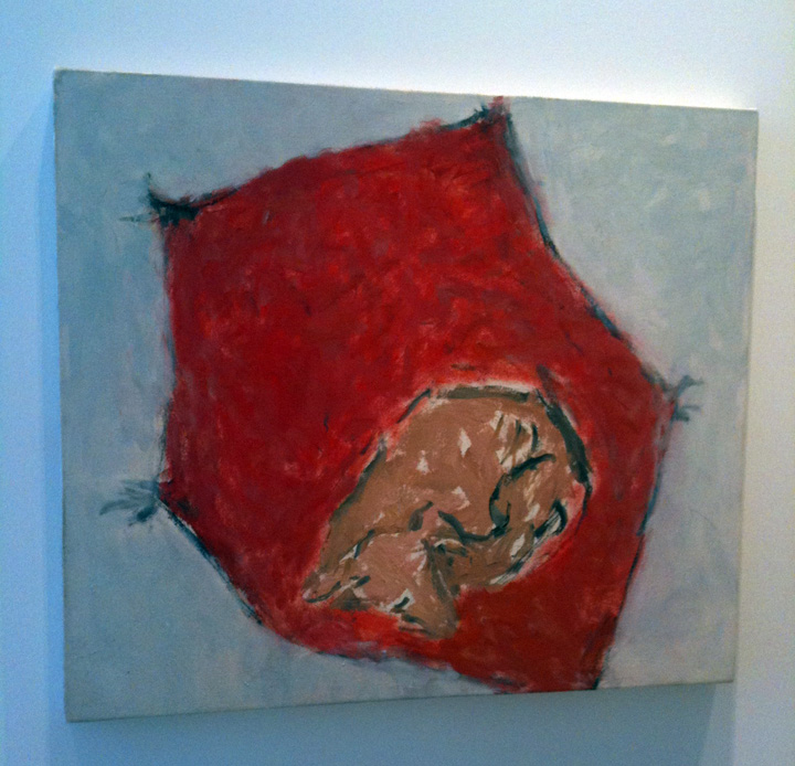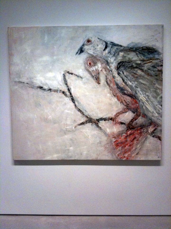 Contributed by Sharon Butler / Susan Rothenberg’s show at Sperone Westwater features vigorous new paintings of birds, circus performers, heads, hands, and smaller paintings of dogs napping in the studio. At first glance, the subjects of the paintings seem unconnected. But the driving force in Rothenberg’s work continues to be the combination of agitated brushstroke and idiosyncratic composition, which enables the painter to move convincingly from perceptual study of the world around her to more symbolic imagery, such as acrobats and detached heads.