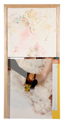Contributed by Sharon Butler / Robert Yoder’s new collages and paintings combined with found papers have a downbeat quality inspired by the sadcore music he’s been listening to lately. The title of his exhibition at Frosch & Portmann, “Beautiful William,” is from a song by the The Handsome Family about a man who goes missing under mysterious circumstances. The texture of Yoder’s gorgeous small strangely delicate. Upon close inspection, sexual and personal details (which are impossible to see in my images of the work) like phalluses, scars, and bruises emerge, creating an air of gloomy libido. And all the found papers have a story, too.