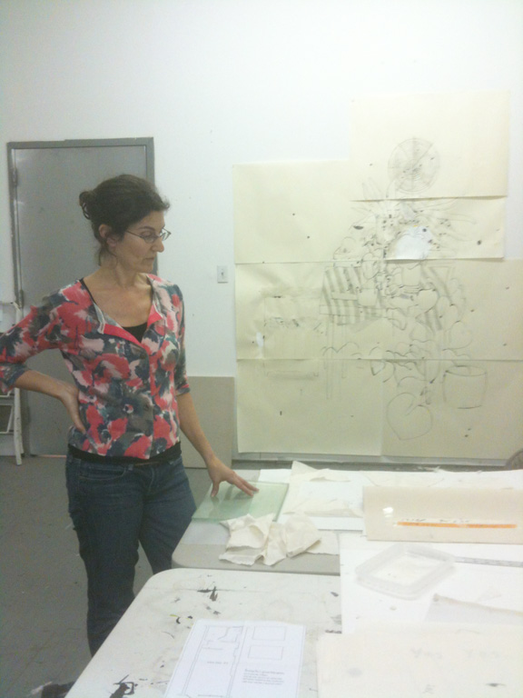 Vicki at her work table with a large still-life drawing, pieced together from several sheets of paper, on the wall behind her. Look for it at Pulse in Miami in December.