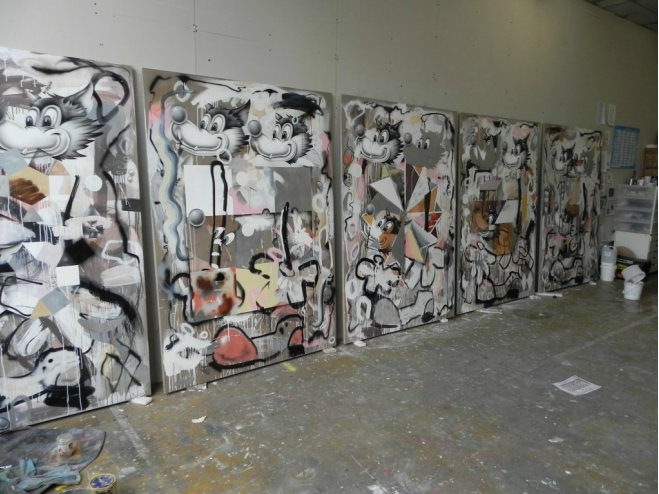 While doing some research the other day, I ran across work by British artist Barry Reigate (b. 1971). In London Reigate is primarily known for his lecherous cartoon imagery of disembodied breasts and Disney characters, but geometric forms like cubes, spheres and pinwheels are also embedded in his large-scale paintings. In his October 2011 exhibition at Paradise Row, Reigate included geometric sculptures and earnest gouaches of geometric volumes, and I wondered if he was in transition, perhaps moving away from the pop culture references. According to Reigate, the gouaches, which have underlying political content, are not just studies for the larger paintings, but are works in themselves.