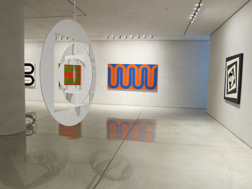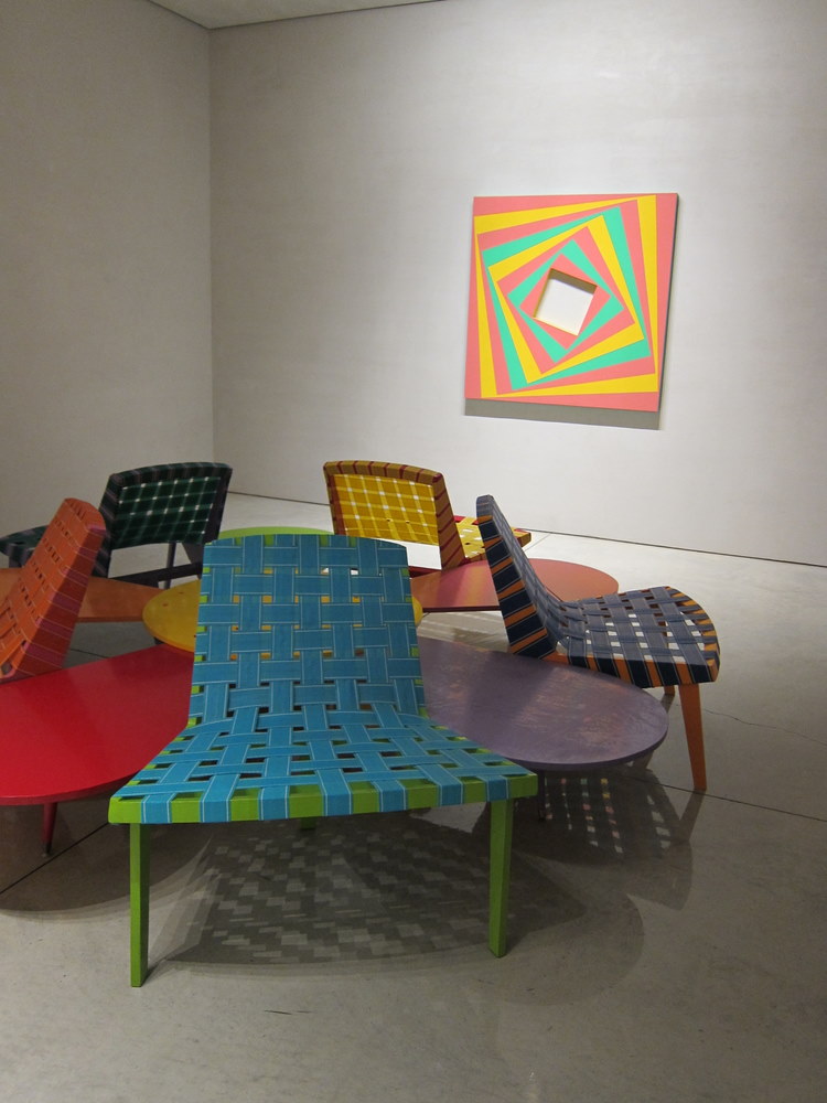 Through next week, Mary Boone is presenting more than a dozen of Jim Isermann’s pieces from the mid to late 1980s and one work from 1993. Isermann belongs to that influential second generation of LA artists who graduated from CalArts in the late 1970s, but, unlike his contemporaries who were absorbed with postmodernist strategy, Isermann was obsessed with super graphics from the 1960s and 70s. The centerpiece of the show (although strangely installed in a cramped side room) is the 1985 Flower Seating Group, a construction of five painted, plywood-framed, lawn-chair-webbed supports, facing out toward the gallery, surrounding five petal shaped tables. A Flower Ceiling Pendant Light and a Flower Painting, both adjunct components of the original 1986 installation, are also included. (NOTE: Don’t sit in the chairs. Although Isermann originally designed them as furniture for a gallery, now the chairs are to be apprehended as an art object. Do not touch!) The Shag Paintings pair latch hook Orlon acrylic yarn panels with hard edge geometric enamel panels, linking his work to the debates about craft that were generated by the feminist contingent.