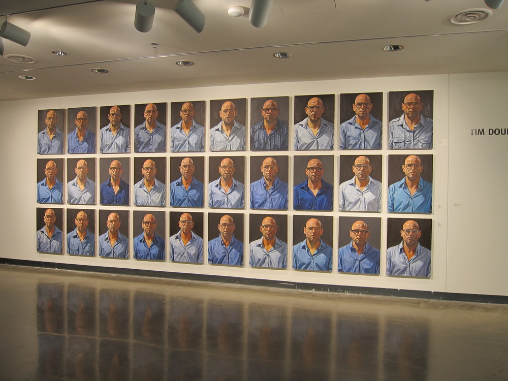 In Tim Doud’s work the figures are fully clothed–he’s interested in the way the traditional portrait functions. For the first series presented (images below), Doud worked with a single model who made all decisions about costume, pose and and even the titles of the individual paintings. In “Blue,” a larger series of self-portraits hung in a grid formation (above), Doud worked on all of the paintings at the same time. In each, the pose remains the same, but the details, such as the patterns of the blue shirts, eyeglasses and background colors change. Doud was scheduled for a solo show at Priska Juschka, but since the gallery is in the process of relocating, the dates haven’t been decided.