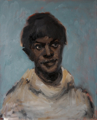 The subjects of Yiadom-Boakye�s portraits are mostly black and often confrontational. In her Shainman exhibition, the expressionistic brush strokes, combined with a dark palette, evoked a stark, theatrical mood. �Although they are not real I think of them as people known to me.” Yiadom-Byakye explained. “They are imbued with a power of their own; they have a resonance � something emphatic and other-worldly. I admire them for the strength of their moral fiber. If they are pathetic, they don�t survive; if I feel sorry for someone, I get rid of them. I don�t like to paint victims.�