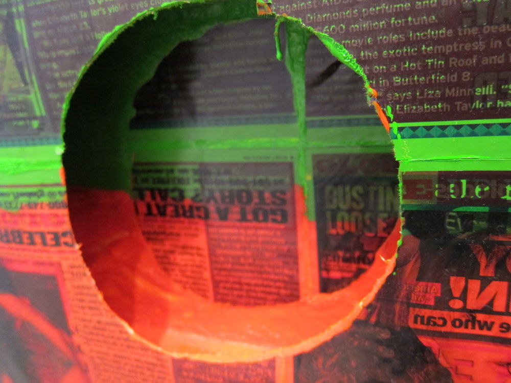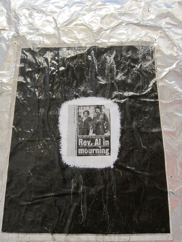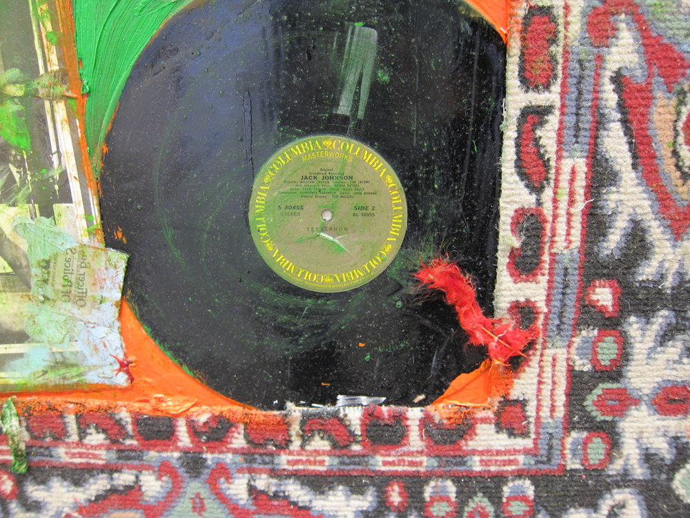 Chris Martin is like a god to young abstract painters, so when the lovably prolific maestro presents new work, celebration ensues. The raucous paintings in his current show at Mitchell-Innes & Nash don’t disappoint–they feature much of his familiar imagery and go-to materials like glitter, newspaper collage, and sewn-together tarps. Many of the ginormous paintings sport cutouts, one of which has become a resting place for a little gnome figurine. Here are a few detail shots I took when I stopped by the gallery.