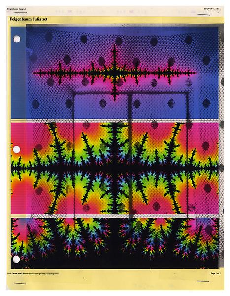I love this. I see so many things in it. I see flower, trees,bugs, all sorts of things. I really enjoy looking at this because of all the colors. Using the colors gives it a bright warm feel, but them on the other hand the black tree looking things in the middle give off a darm mystical feel. The bright and the black are godd contrast to eachother.