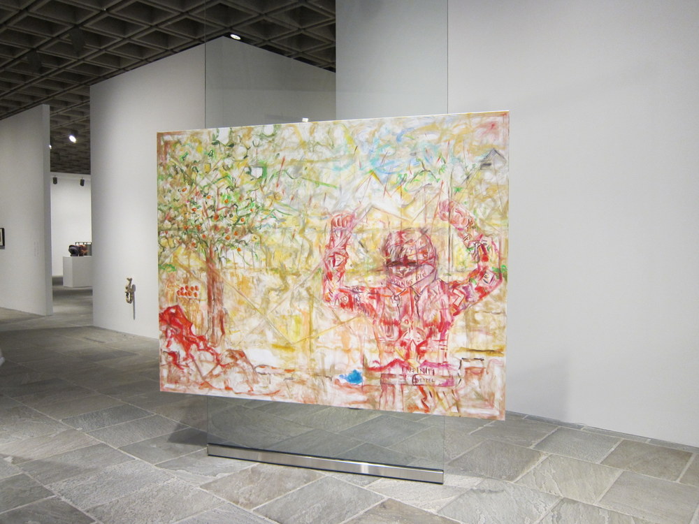 Performance artist and painter Jutta Koether (lives in New York and Berlin, born 1958) hung her paintings back-to-back on thick sheets of glass. Clustered around one of the odd-shaped windows, the paintings reference Nicolas Poussin�s painting cycle The Four Seasons (1660�64). Koether, who is interested in creating a contemporary context for a traditional medium, wants to challenge her audience to “reconsider the framework through which they see and interpret paintings,” but the installation and text seem overwrought. The light, agitated brushwork, illusive imagery, and art historical reference make the point. Above: The Seasons I, 2011, synthetic polymer and oil on canvas, glass, 67 x 86 3/8 inches. Collection of the artist; courtesy Galerie Buchholz, Berlin