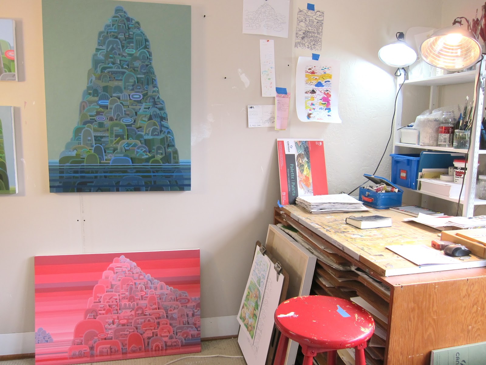 Griffith has converted his living room into a studio. Here is his drawing desk and some recent acrylic paintings on canvas. Click to enlarge.