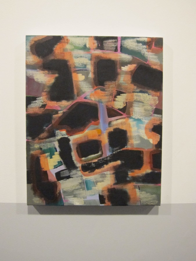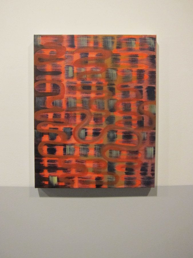 “Oscillations” can be taken to refer to either the striated facture and vibratory color combinations present in each of the eight paintings in the show, or the eclectic style in which the works are painted. From the black curved lines and flat, subtle brushwork of Traipsed, which evokes the early abstractions of Mondrian, to the radiant, Kupka-like facture of Astrology, the works take as their starting point diverse early-twentieth century experiments in abstraction. Dill’s heterogenous “Oscillations” can be taken as a reaction to the commodified ”signature style’ often associated with painting, and as a feminist critique of the masculine trope of the unique and expressive, involuntary gesture. Yet the work exceeds this reading to yield pleasure in its wide-ranging references to the past and in its vibrant, nearly textile materiality…