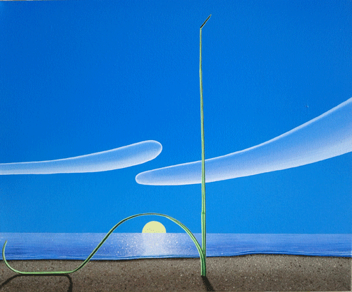 Matthew Fisher here, from Unfunny Show and French soldiers. I wanted to let you know that my work has made a major shift: away from the figure, props, historical, and pretty much everything else that defined my “earlier” works. I have kept the bewilderment of the nature’s awesomeness, and strayed into a more stylized/abstract depiction of the ocean and sun. After my last show of stacked still life objects, I really wanted to get lost again in painting and seriously set out to discover something new to paint. It wasn’t until I sat down, and told myself to draw “nothing” that I stumbled upon the motif of the beach grass and setting sun.