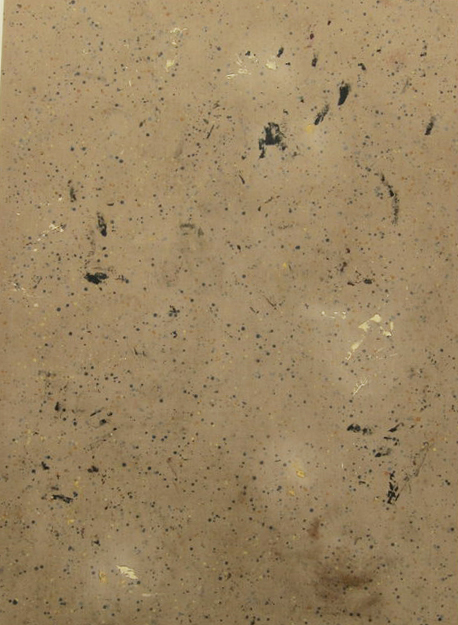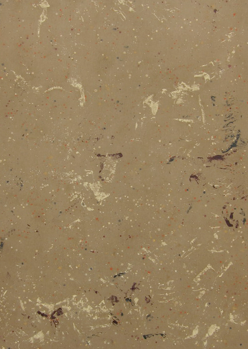 all-over compositions, or what he thinks of as “white noise.” After applying paint and solvents, he leaves the pieces outside where the weather ages them prematurely, giving them a pseudo history that evokes the poignant narratives of the authentic drop cloths that inspired them.