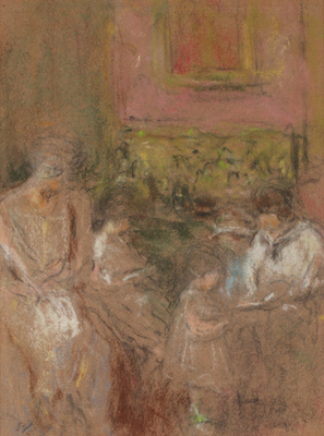 On the website for the Edouard Vuillard show at The Jewish Museum, a lovely show of gem-like portraits and interiors, I found images of two versions of the Bloch family portrait along with preliminary pastel sketches that reveal how this beautiful painting took shape. Here they are, along with an interview with Claude Bloch Dalsace, one of the children depicted in the painting.