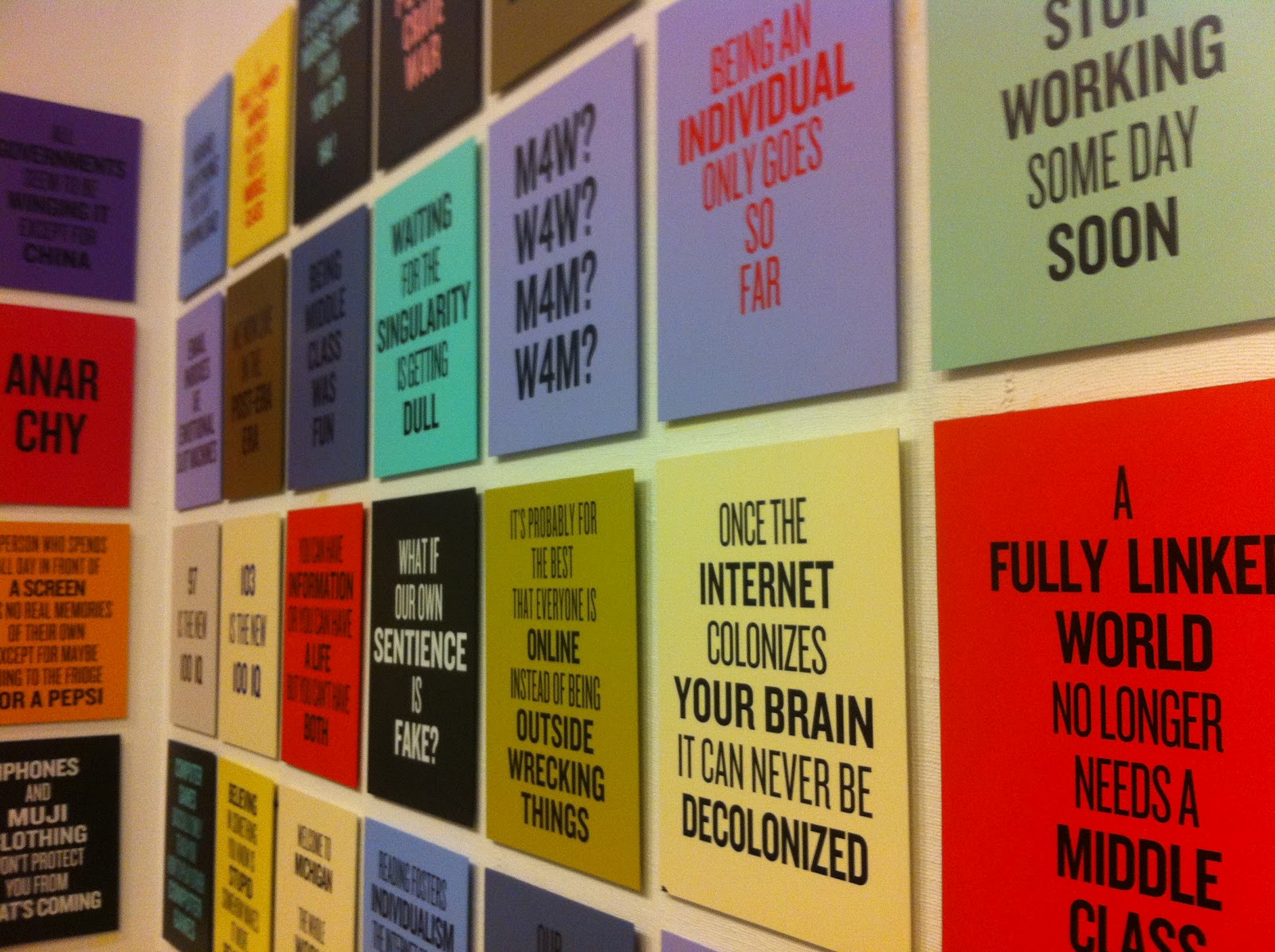 Acclaimed author and visual artist Douglas Copeland continues to expand his body of work involving hand painted slogans.”If you were to attach a stick to each of these slogans and carry them in the street, would they read as protest or would they read as complicit guilt?” Coupland muses, ” For example, twenty years from now, were I to look at a picture of someone holding up a slogan reading ‘being middle class was fun,’ would that read as a heartbreaking prescience or as rational acceptance of a by-then sociological certainty?” 100 of his sharply observed slogan pieces is on display at Daniel Faria until the end of the week.