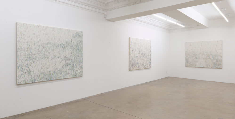 At 11 Rivington and 195 Chrystie, Keven Zucker (American, b. 1976) presents views from hotel balconies. Reducing his photographic source material to diagonal lines of pastel-colored pixels that mimic driving rainstorms, Zucker makes inkjet prints and transfers them onto large-scale canvases. Defying their analytic origin, the images are surprisingly poignant.