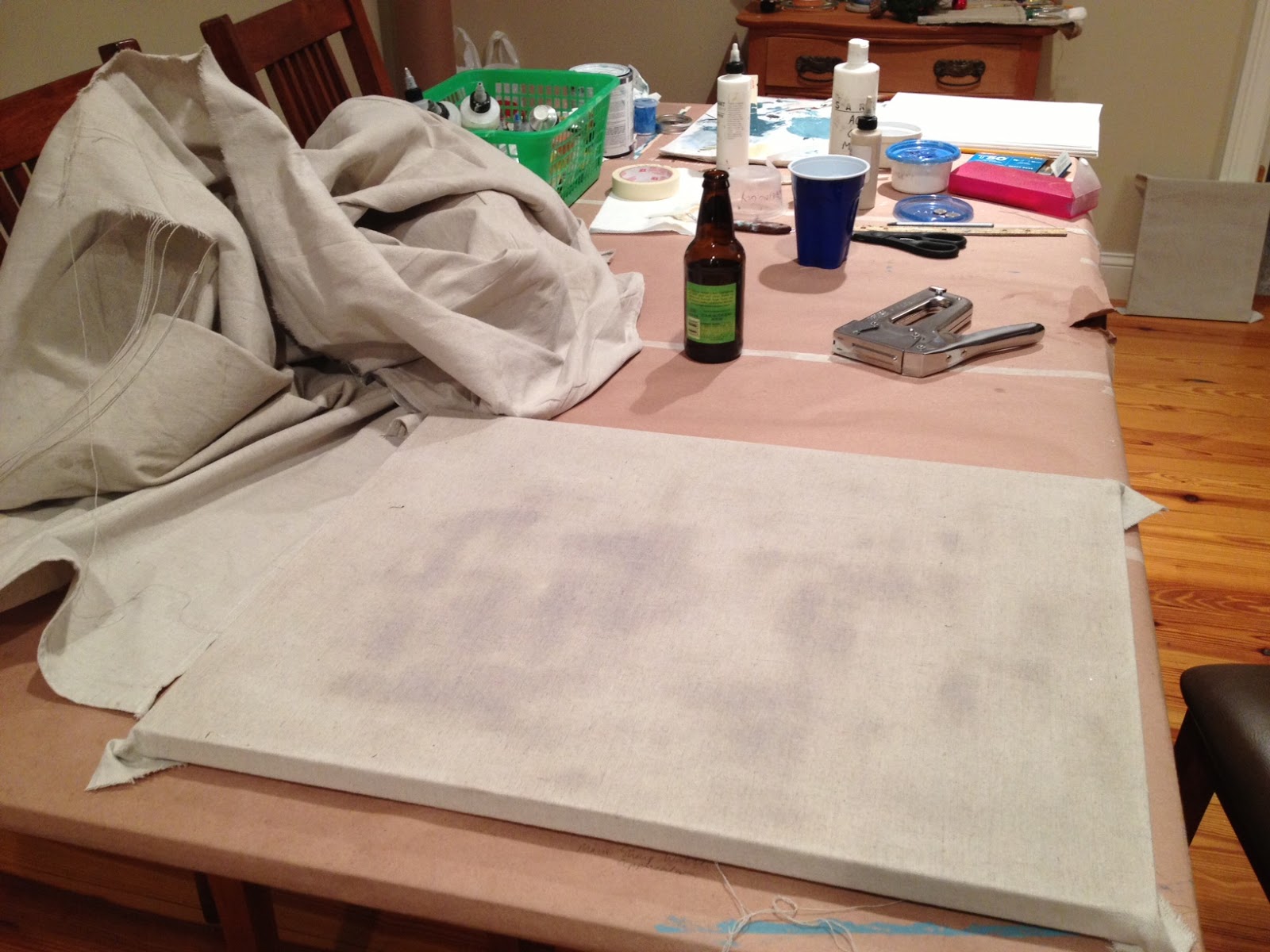 In Butler’s new work, stretchers are no longer hidden, voiceless platforms for paintings but rather partially revealed elements of the work, haphazardly wrapped with wrinkled tarps. The resulting Rauschenbergian sense of earthy imperfection and chaos, though, is balanced by well-anchored painting distinguished by skewed perspective, geometric structure, sensitivity to form, minimalist economy of detail, and worn-out pastels.