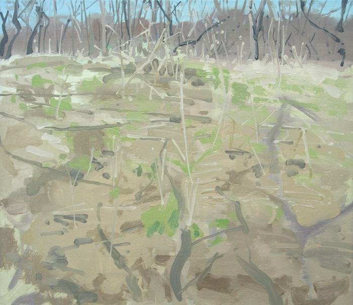 began as an exercise in color, not initially intended to become their own body of work, but as time went on, they started taking on aesthetic and technical qualities that the observational work, made on location, had been built upon. The paintings began informing each other, many times unknowingly at first. The muted color palette and linearity of mushrooms laid out to dry on a table can make their way into works consisting of large seemingly haphazard brushstrokes, layered and scraped away. The accuracy of color placement and representation of light in the observational paintings inform the abstractions, allowing both to exist as windows into environments either recognizable or contemplative.