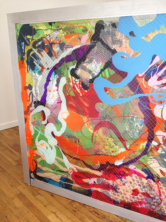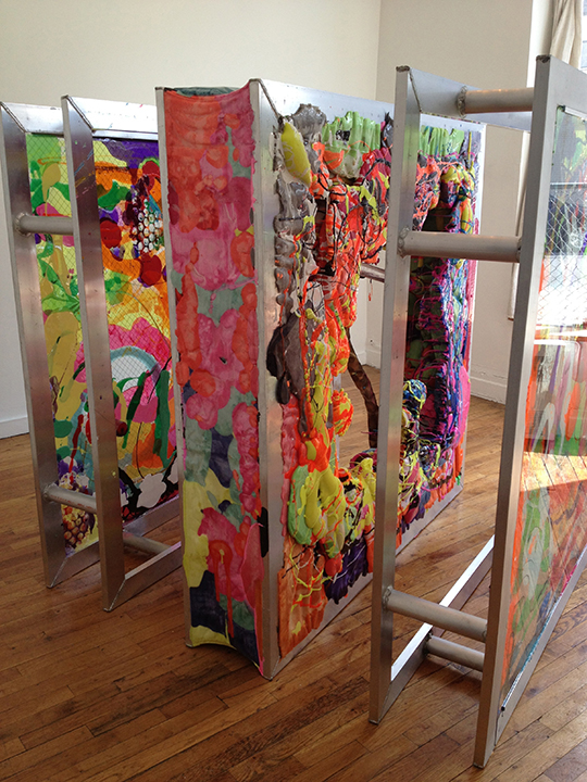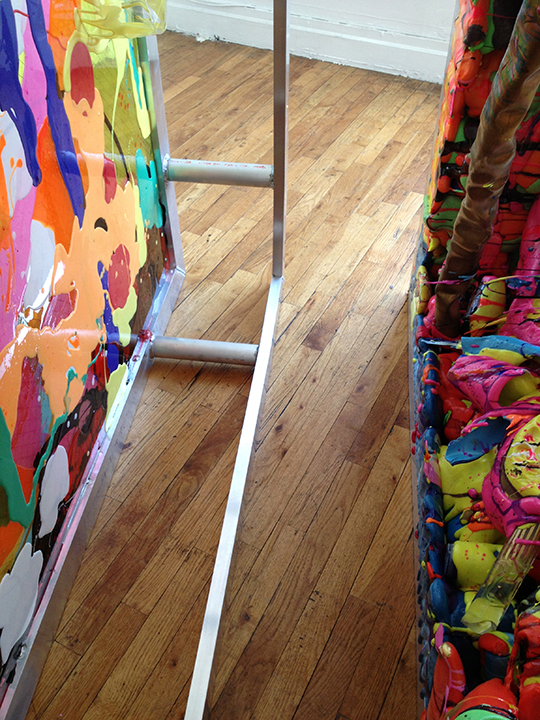 Contributed by Sharon Butler / Crafted from aluminum, neon-colored foam, paint, and plastic materials such as bubble wrap, plastic cups, and other discarded detritus, Ben Godward’s work has always careened impulsively toward excess and chaos. More restrained than previous work, Voitenko vs. Berkeley (contemplation of the imploded past perfect (intremes) (2013) tempers Godward’s signature exuberance with the geometric unity of a Donald Judd cube construction.