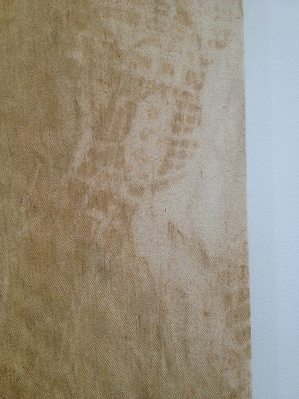 Known for using unexpected materials like trash and bubble gum to make paintings, Dan Colen, presents bootprints on unprimed canvas.