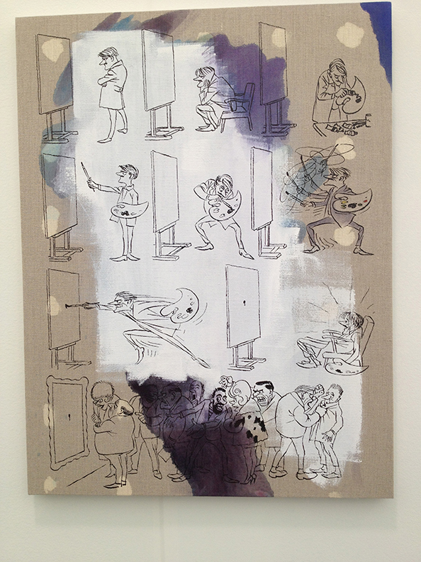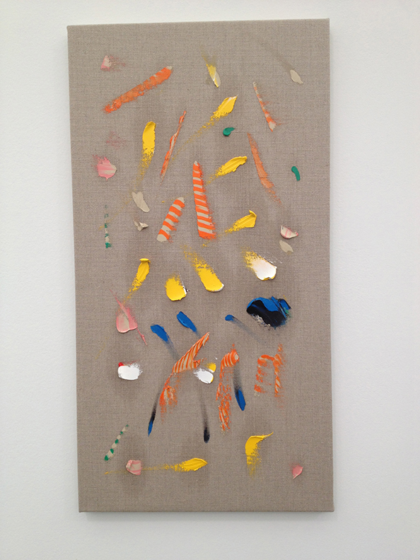 This small 2013 piece by Lesley Vance may look like it’s made on unprimed canvas, but actually it’s linen painted a canvas-like color. When artists start painting primed linen to look like unprimed canvas I have to conclude that the irresolute look of unprimed canvas is unquestionably having its moment. Perhaps the growing presence of this type of work at Frieze is a signal that dealers and collectors are finally warming to elements of provisional painting and casualist abstraction.