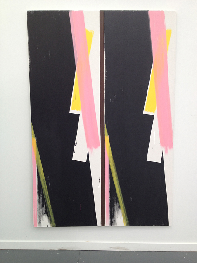 Readers may recall that in 2010 Piffaretti (b. 1955) was included in “Le Tableau,” a group show of French post-war abstraction curated by Joe Fyfe, and, earlier this year, Piffaretti had a solo show at Cherry and Martin –his first US solo in a decade. Piffaretti is known for his intellectual approach to abstraction and a seemingly rigid, systematic painting process. After dividing his large canvases in two equal vertical sections, Piffaretti paints one half intuitively and then paints the second half exactly like the first.