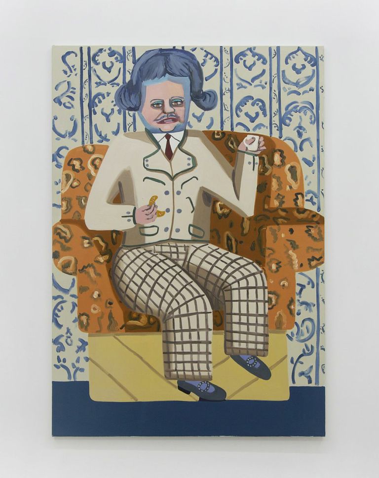 Looking toward the matronly but androgynous figure on the fourth wall, the Lars Von Trier woman completes the circle. Sitting on a big easy chair that rests atop a crate, the final figure, sporting a Thatcher-esque helmet hairdo and Mary Jane shoes, stares defiantly at the viewer, a biscuit in one hand and a diminutive teacup in the other.