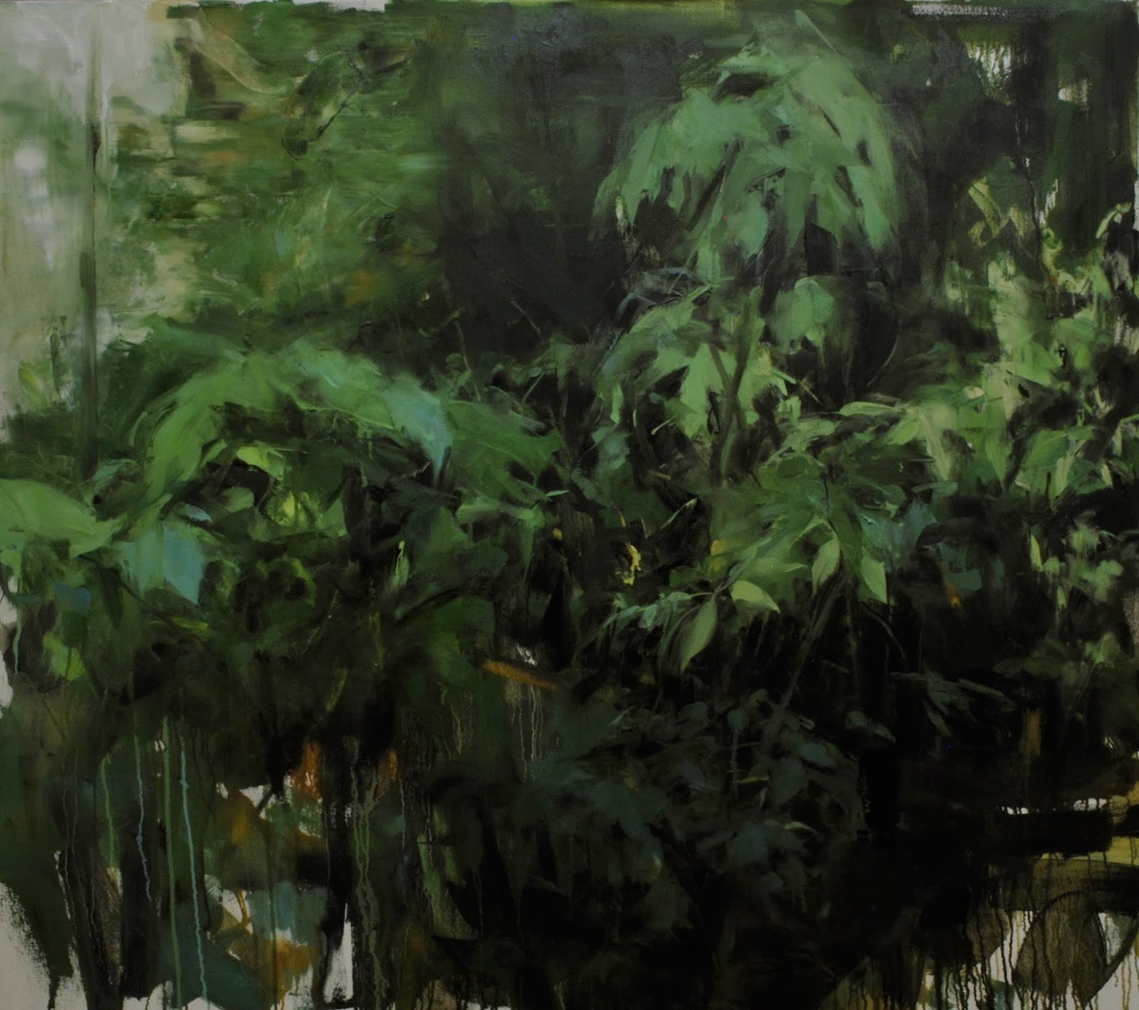 Each piece, like its referent from Mann’s arboreal wanderings, is a tangle of layers: in the drawings, it�s the soft, rich black solids of charcoal, and the dry, scratchy marks of willow stick; in the paintings, its watery washes and stains, thick impasto, and blank canvas.