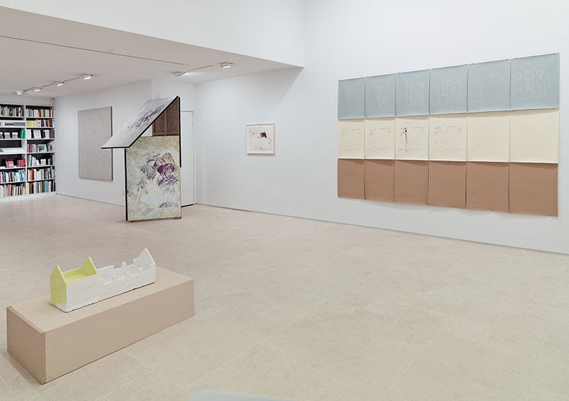 Further inside are two drawing installations, pinned to the wall in a grid format. Rendered on ivory, brown and blue-gray sheets of paper, the drawings begin with the underlying pencil grid (as seen on the large linen piece), and bits of architectural detail are inked in on top. The few austere gestural houseplant paintings seem to be included to warm up his faux architectural work, the way actual plants