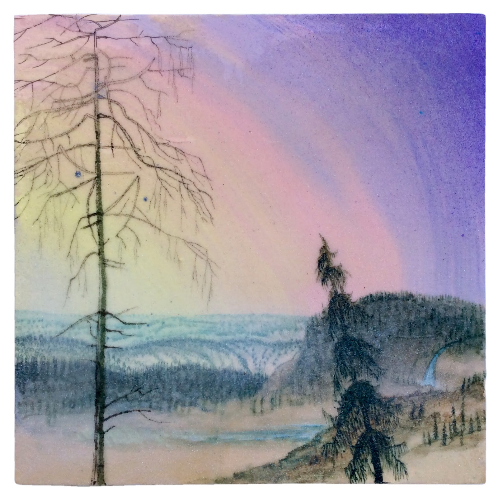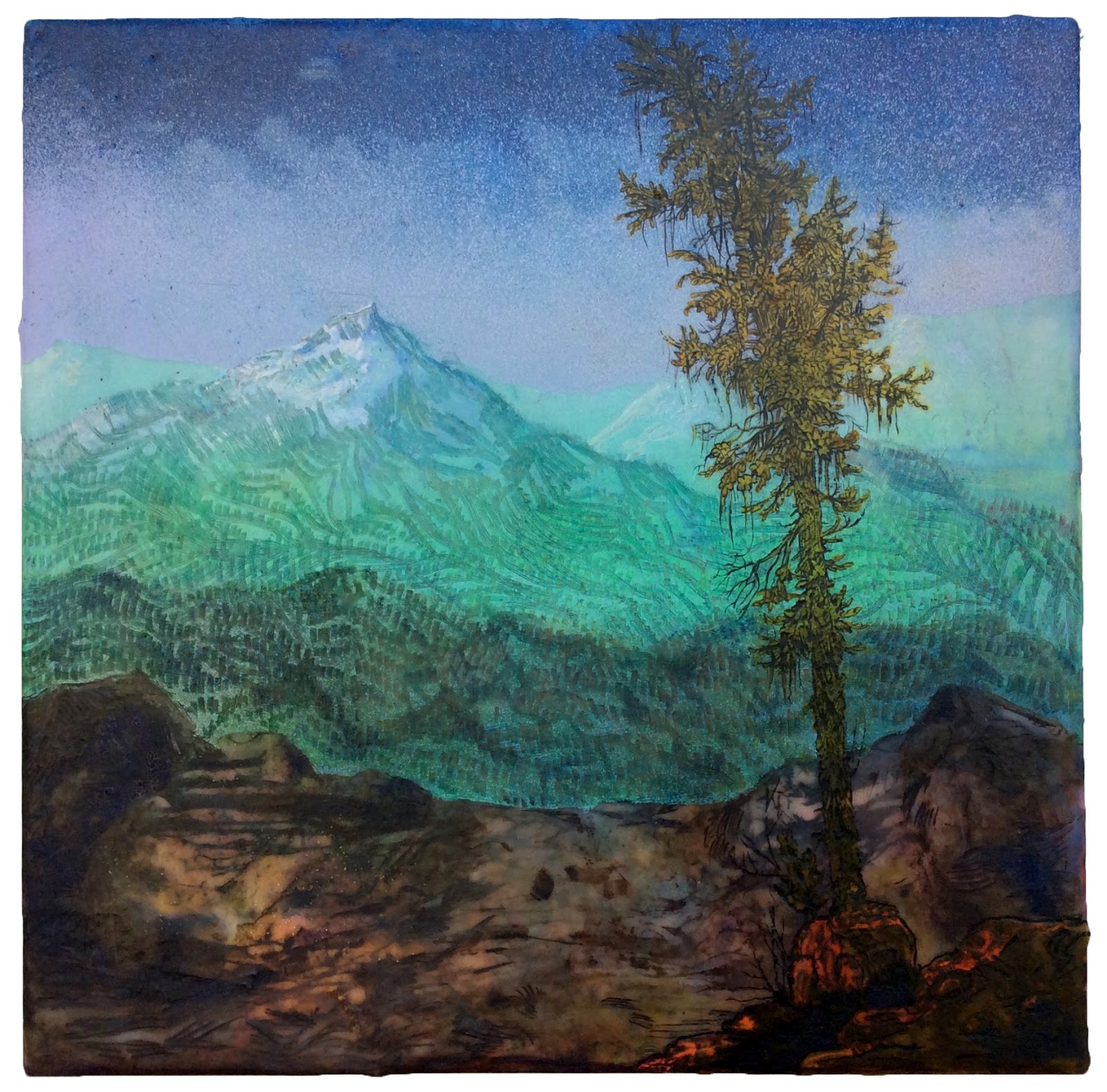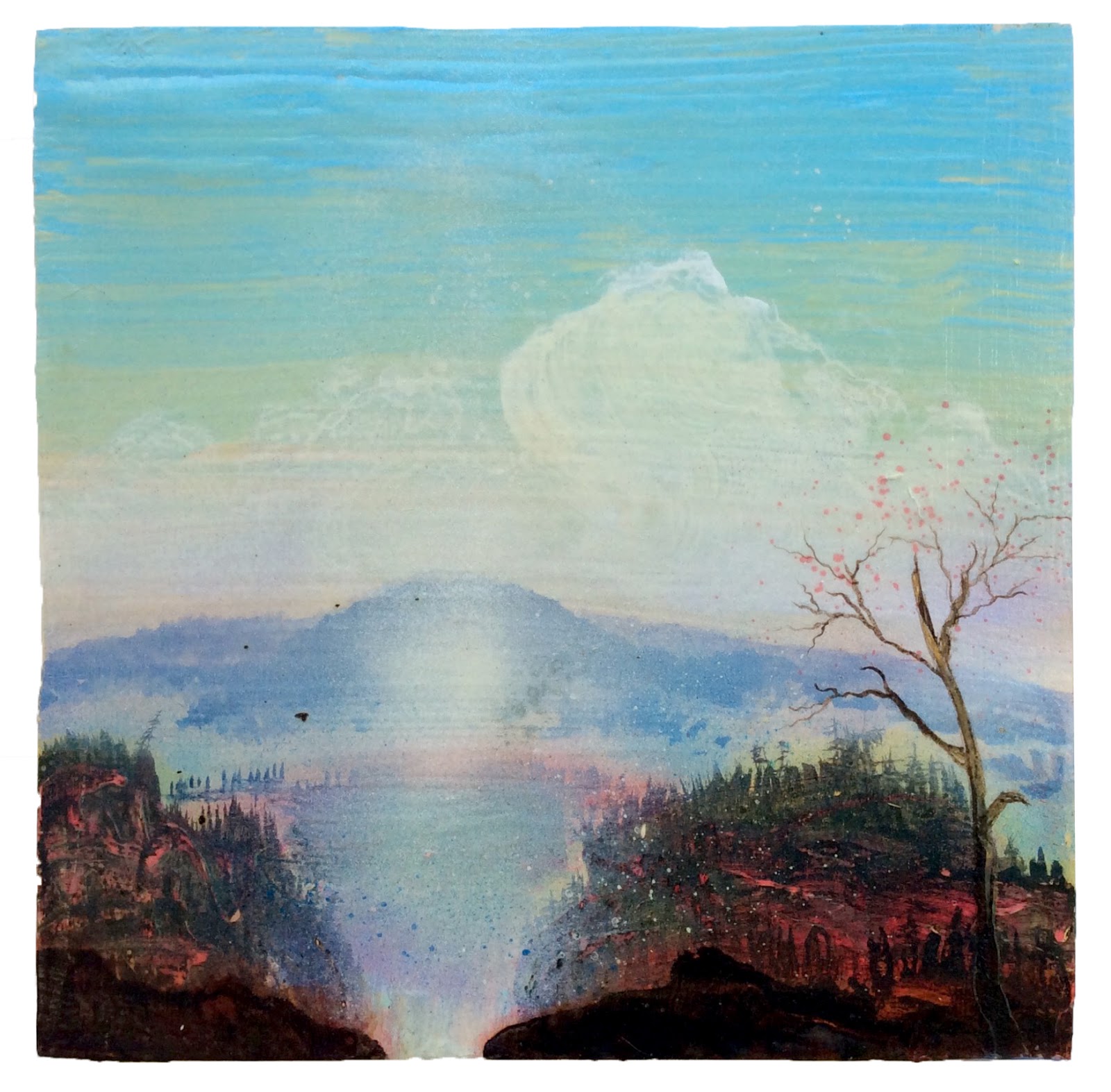 Joan Nelson’s delicate landscape paintings feature images that seem familiar: spindly trees, sparkling waterfalls, vivid blue skies. Indeed, for three decades she has borrowed details from the majestic landscapes of painters such as Albrecht Altdorfer, Albert Bierstadt, and Edward Hicks. In this recent series of paintings, on view at Adams and Ollman through July 11, Nelson references an Oregon road trip she took several years ago. Inadvertently getting lost, Nelson found herself driving through the Columbia River Gorge, the rolling hills of Mount Hood, and the foothills of the Three Sisters mountain range. She was so taken by the views that she didn’t turn back.