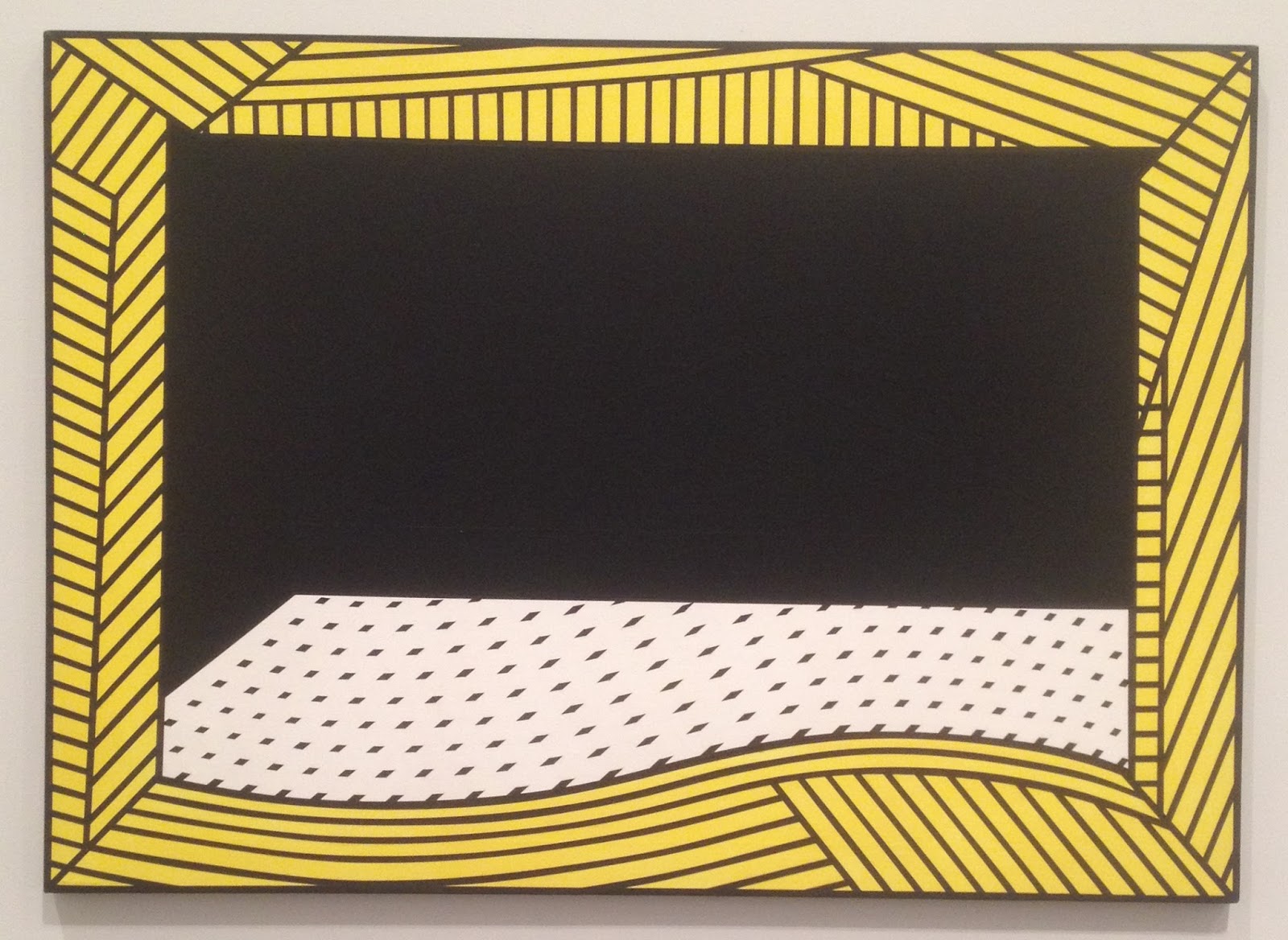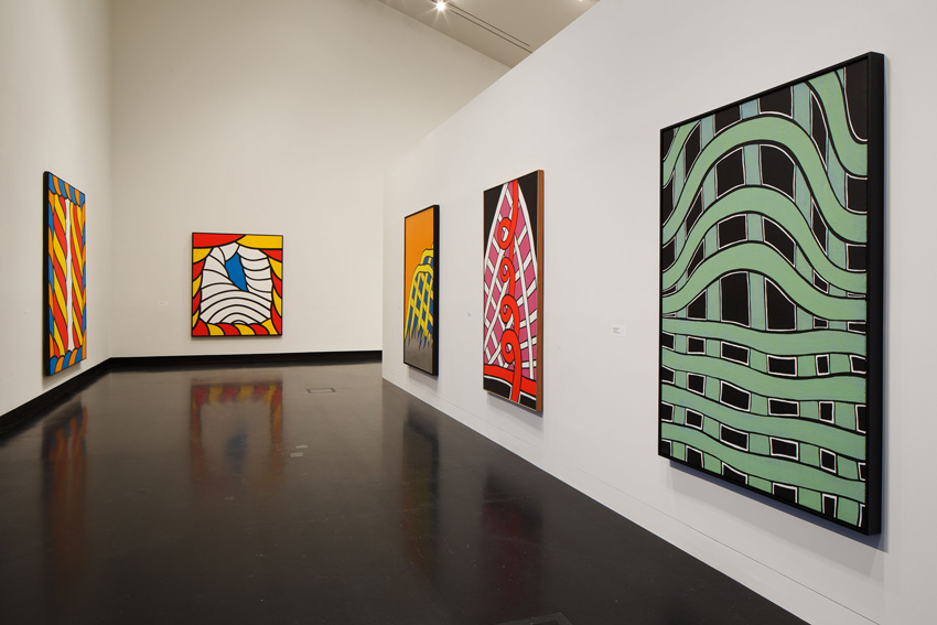 Contributed by Sharon Butler / Last week at the Frances Young Tang Teaching Museum and Art Gallery at Skidmore College, I got a chance to catch the Nicholas Krushenick retrospective, which is up through the end of August. Krushenick, who died in 1999, is best known for fusing popular culture with non-objective abstraction. The result is an aggressive, eye-popping style, full of bold line, highly saturated color, and visual ambiguity. “We are stuck with three basic colors and thirteen basic shapes on this universe,” Krushenick said in 1978. “Those sixteen elements are all we have. I think it’s unfair, so I am trying to figure out a way to unstick ourselves, to expand our intellect one more time.”