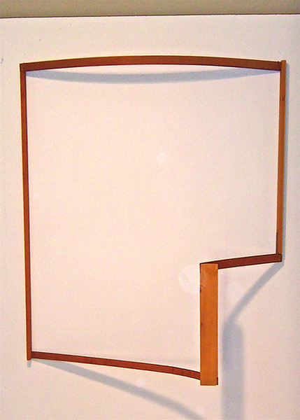The curators duly recognize the organic connection between painting and sculpture, and between sculpture and installation. Christopher Joy’s untitled little abstract piece acts as a clever meta-check on the exhibition’s expansive theme, featuring chunky support and a graphic 3-D style suggestive of sculpture while clearly remaining a painting. In turn, Harry E. Leigh’s spare wood geometric frame, gently warped, moves into the realm of sculpture — but only by a delicate Sandbackian increment.