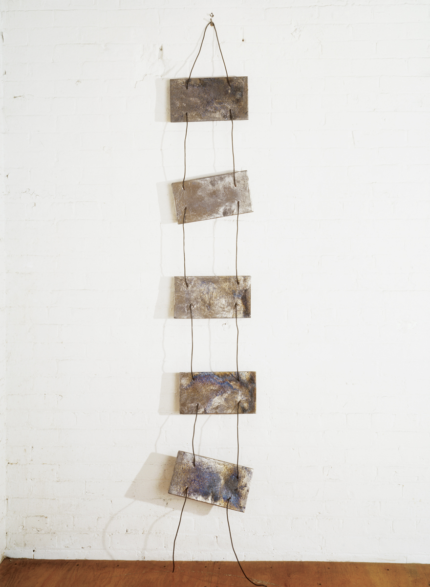 A virtuously restless artist, Zito also drills into more particular political and social issues such as war and race. The helmet of Untitled (helmet) (2005) is not a genuine soldier’s cover but rather a translucent facsimile made of cast glass laid on a truncated steel pedestal: sprinkled with flowers, it’s a sardonic comment that a helmet’s protection is substantially illusory, and that military death, while dutifully beautified and memorialized, remains mainly unseen, at foot level. The seven metal points rising aggressively from the floor nearby, resembling a missile array, are notably higher, as are the infant body bags fading heavenward in Ascension (2005). Three painted copper cookie jars shaped like black housemaids hanging on a tether from a lawn jockey’s hand in Mammy (1996) sound a sweet note when struck, signifying the disguised corrosiveness of whites’ subjugation of blacks, and prefiguring work like Nick Cave’s.