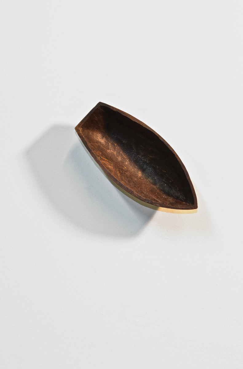 The practically unliftable slabs of My Weight in Lead (1992) are strung together like rungs in a rope ladder, amplifying their uselessness and perhaps anticipating a weary, post-Serra point of view. Indeed, a key to Zito’s efficacy is his controlled infusion of what he calls “primal emotions” into objects he admits are outwardly Minimalist/Conceptual. Zito uses size and especially negative space to lend nuance to his angst. Adrift (2013), a tiny bronze dory, created in an “edition of one,” fixed in a southeasterly slant on an expanse of white wall, embodies not just objecthood but solitude and its perpetual nature. In Stand Still God Damn It (2012), an hourglass with unmoving red sands imparts the creeping agony of time’s passage.