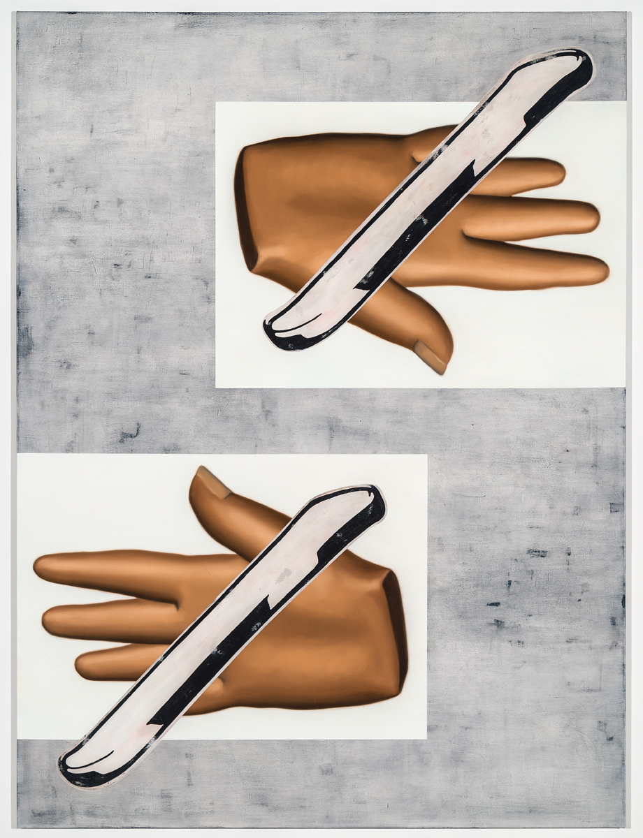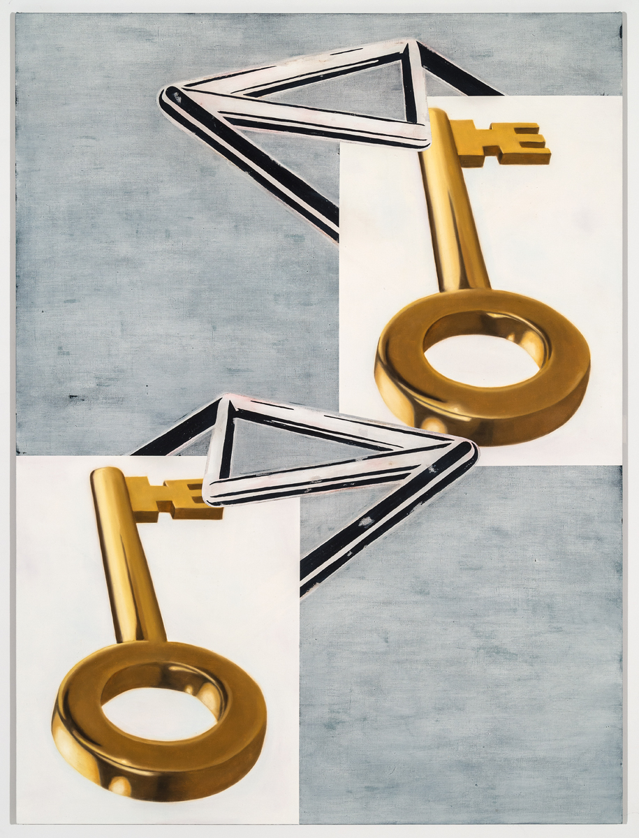In Juggler, the razors sit on discombobulated hands, suggesting now unnecessary danger that remains kind of sexy. The keys in Sequence appear to be the size of sidewalk flagstones, like grandly ceremonial �keys to the city� made of gold cardboard, seeking notional tumblers that don�t really unlock. Like a low-tech saboteur, rope ominously slithers up and down what looks like a florid escalator in M�ander (German for �meander�). The silver jigsaw piece in Puzzle, an especially witty painting, seems to be draped in celluloid film, as if to enshrine one effectively obsolete thing with another.