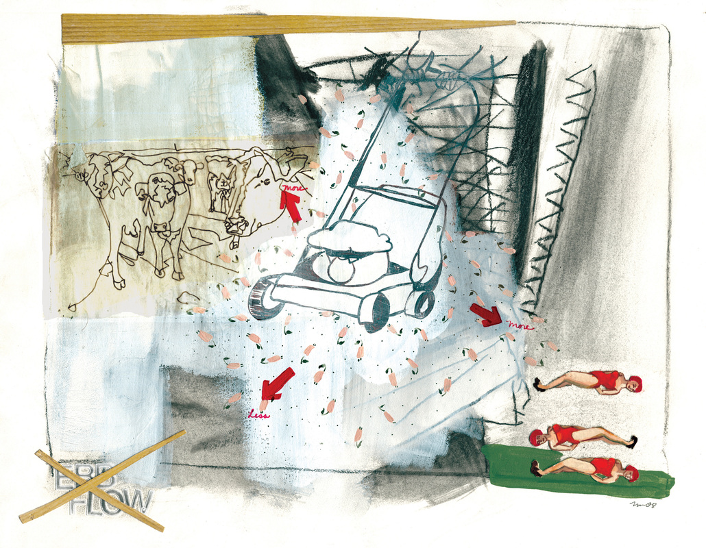 Nancy Morrow’s Blow (2009) reads as a patterned, abstracted “collision of sources,” as the artist put it, forming a flattened environment in which cartoon figures dominate an imagined narrative. While her works of the same year feel like someone else’s memories, they are accessible in that they follow the logic of illustration. In this composition, a man using machinery causes turmoil in the home; in another, a lawnmower seems to tear apart the corporeality of a woman. Pattern permeates each space, from dark corners of the home to thought bubbles.