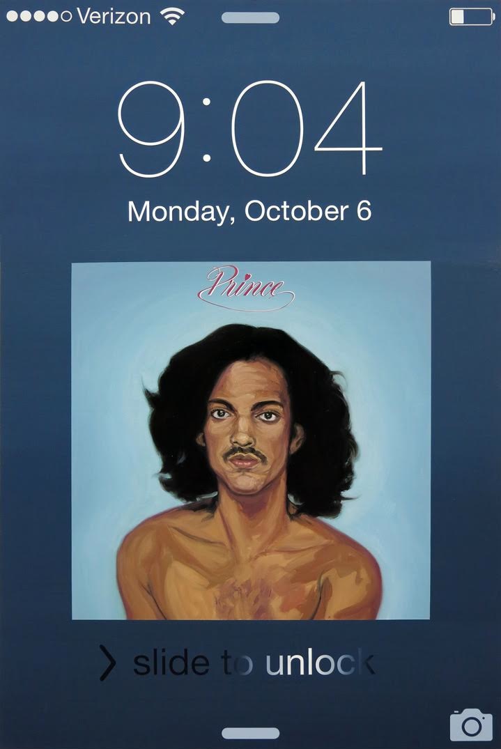Daniel Kingery: I hung these paintings at this height to document them, pretty much. Also, I hung them at this height when I noticed that because of the placement in the iPhone design the portrait is lower. The funny thing about doing these paintings based on the iPhone screenshots is that if you hang it at a more standard height you are looking down on the portrait. When I hung it a little bit higher, his head�Prince�s�is pretty close to my height. That was a funny side effect.